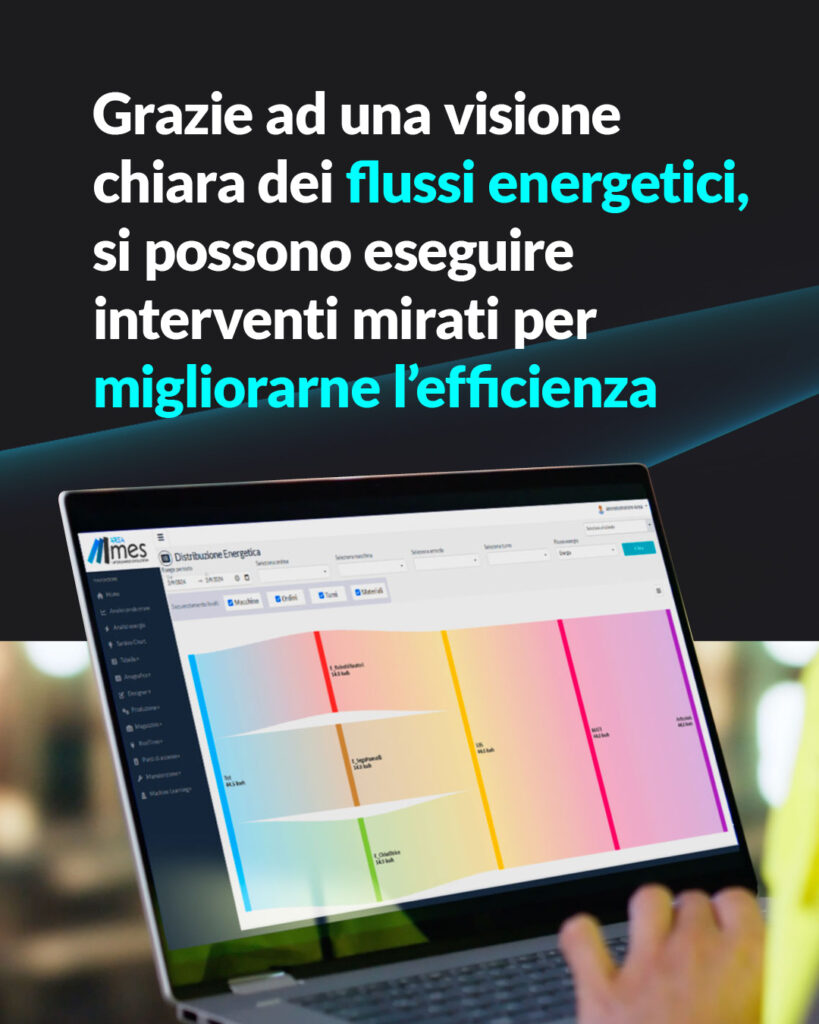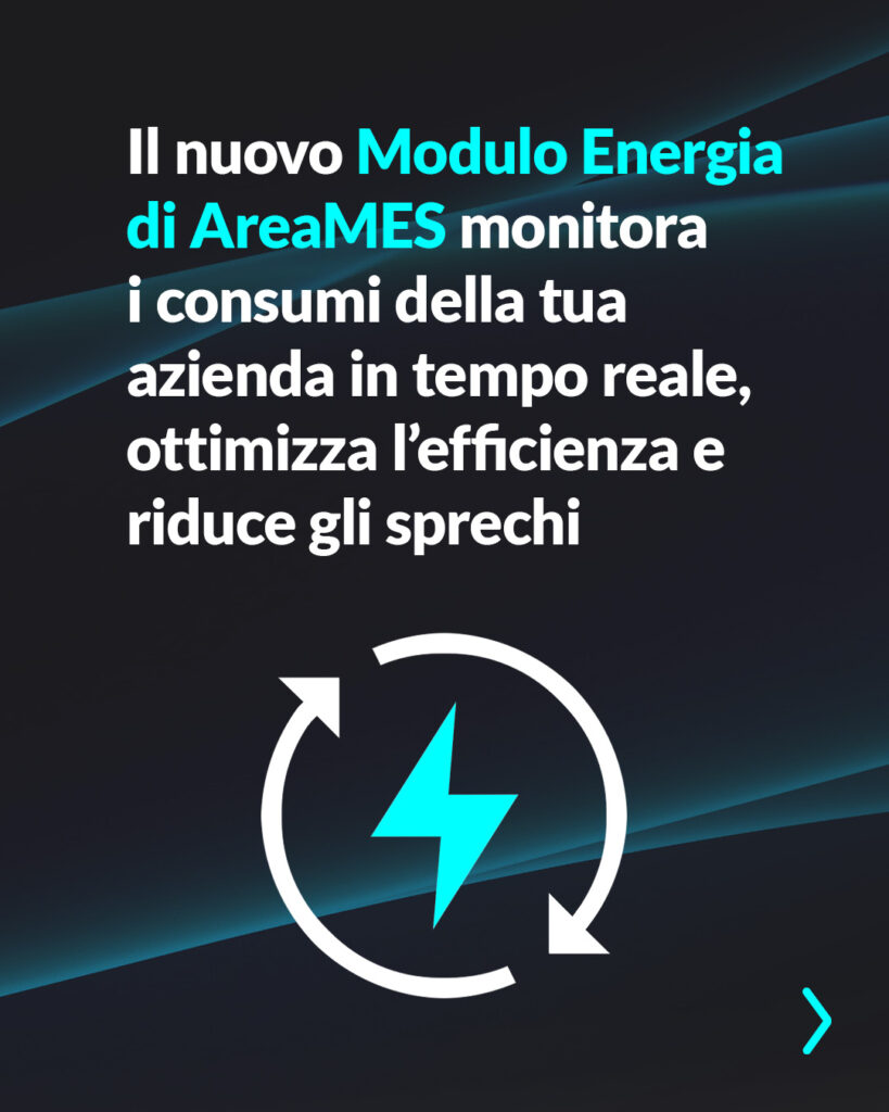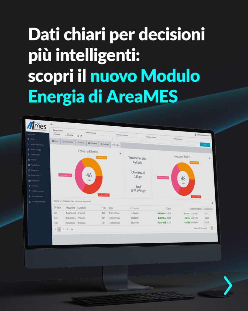 Nella dashboard principale del MES viene introdotto l’indicatore EnPI (Energy Performance Indicator), ovvero il rapporto tra il consumo effettivo della macchina e il consumo teorico. Si ha la possibilità di analizzare ogni centro di lavoro con filtri impostabili e calcolare la stima economica dei KWH consumati, indicatore di consumo per centro di lavoro, per articolo e per turno.
